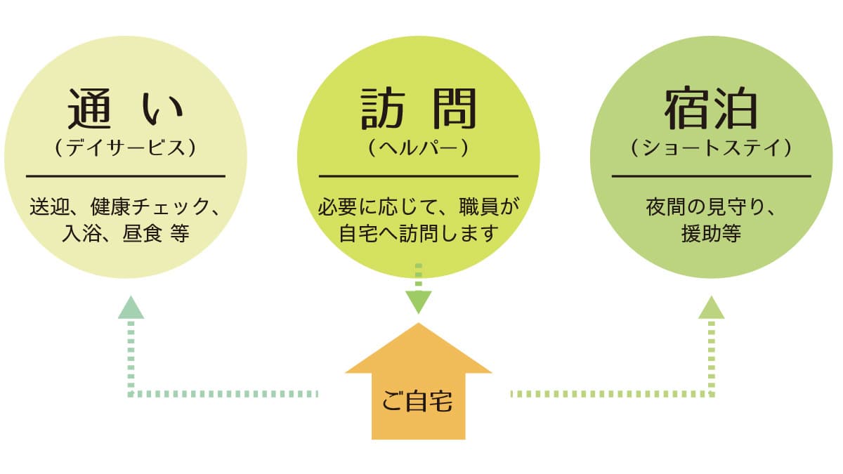 通い、訪問、宿泊、3通りのサービスを自由に組み合わせてご利用できます。