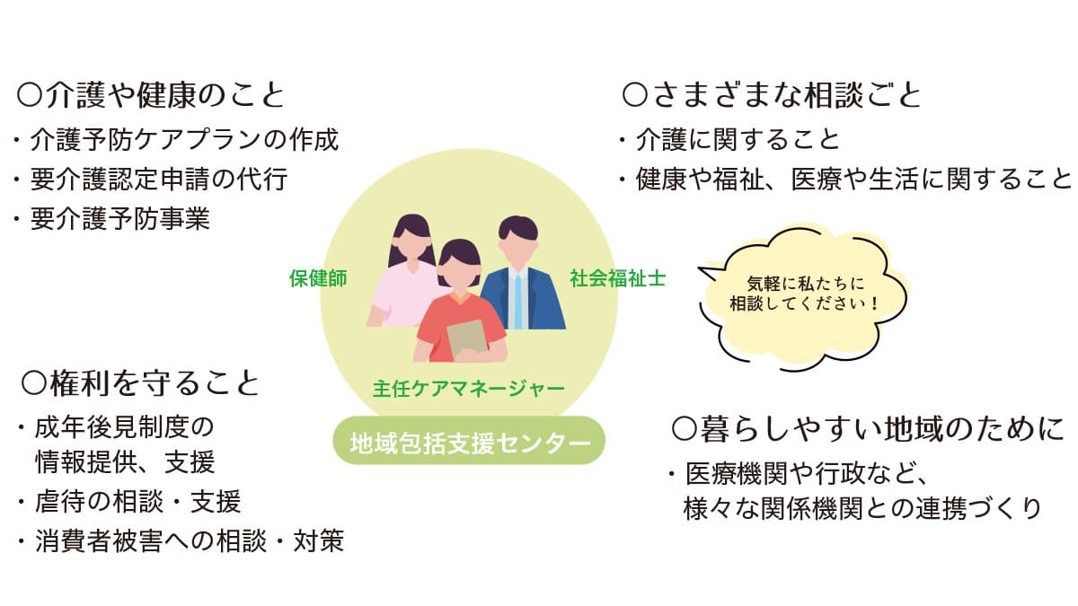 地域包括支援センターには、主任ケアマネージャー、社会福祉士、保健師がいます。